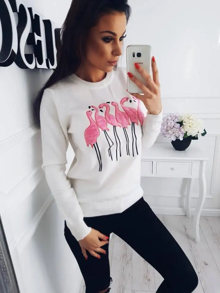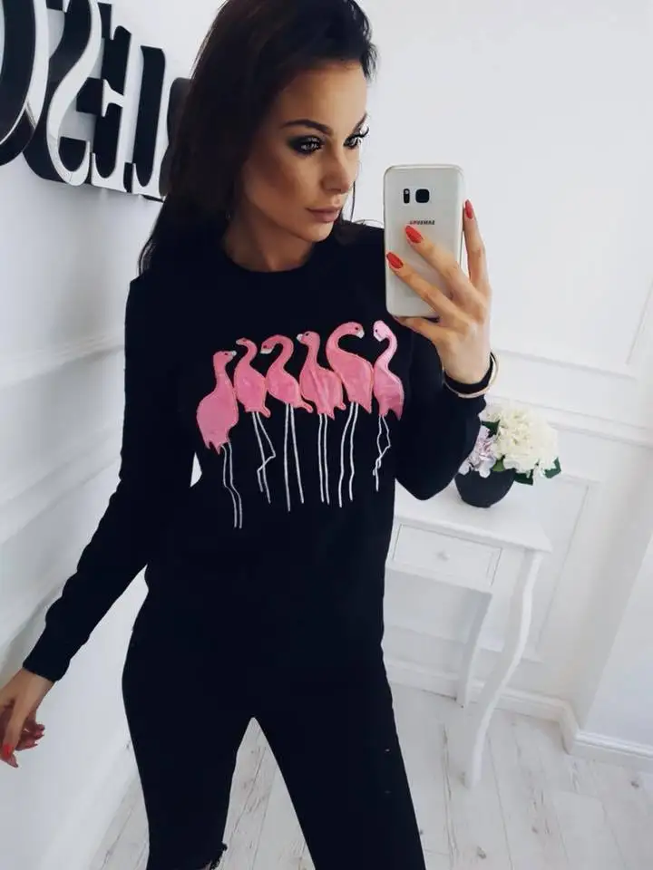 Mega Sale Madam clothing OWLPRINCESS Flamingo Embroidery Long Sleeve Shirt Women T Shirt Loose O Neck Pullove